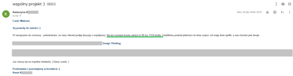 Kasia, dzięki zdobytym w Akademii kompetencjom i wsparciu autora kursu, pozyskała klienta na realizację projektu o budżecie ponad 90 000 złotych.